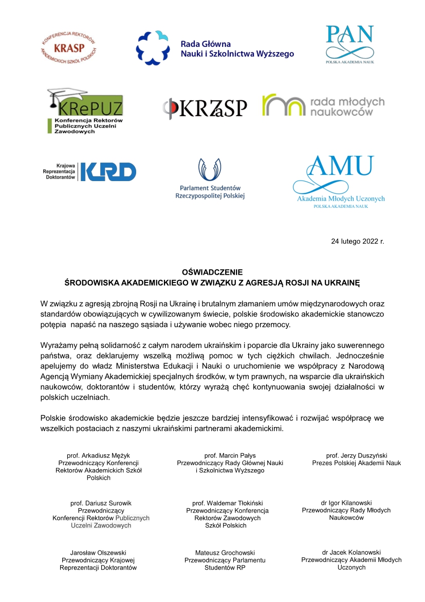 Oświadczenie środowiska akademickiego w związku z agresją Rosji na Ukrainę